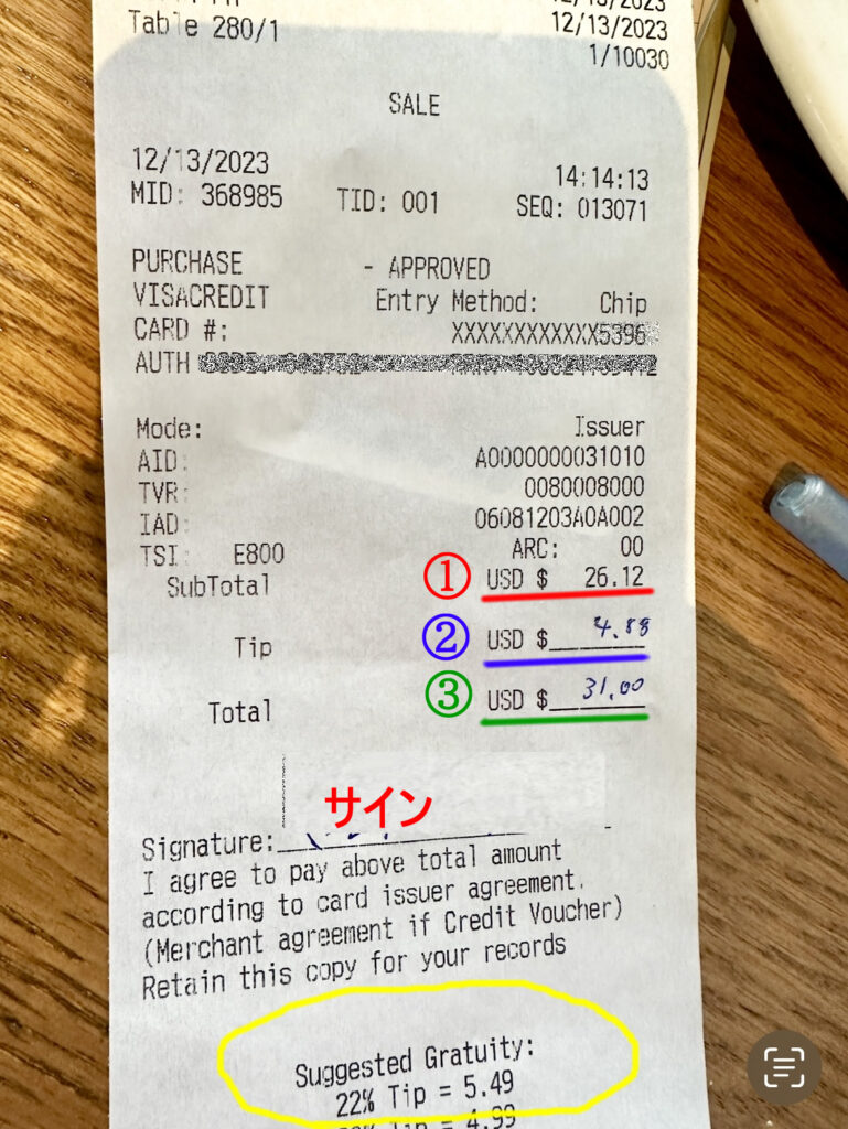 僕の場合は、商品とチップの合計額がキリのいい数字にすることも。添付しているレシートでは「商品26.12ドル」と「チップ4.88ドル(18.68%)」として合計31ドルにしました。