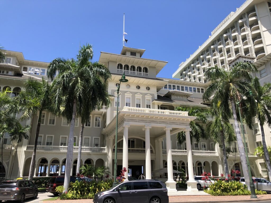 カラカウア通りにある、白亜のホテルモアナサーフライダー。